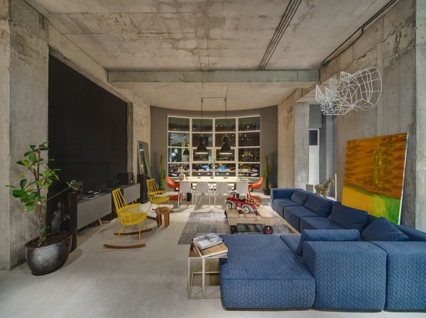 The concrete walls are certainly a main design point that brings the space into that industrial trend. In fact, when architect Sergey Makhno was first putting together a plan, those lovely concrete walls become somewhat of an obstacle. The way the sound bounced off the hard surfaces made it difficult to work and to focus, which led to the inclusion of sound absorbing panels, similar to those that might be used in a recording studio.