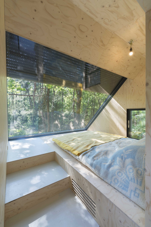 From the architect. On top of an existing 1950s holiday home, hidden in the forest, a sculptural, compact and sustainable rooftop extension climbs out of the original structure and seeks it’s way towards the great vista over the open grassland enclosed by the forest. The extension is situated within the leaves and feels like a secluded tree house.
