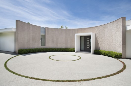 At the exterior, the front façade was re-organized as a simple, platonic gesture in the curved shape of a monumental wall. The elevation is clad in ribbed Indiana limestone panels. The rough stone contrasts with the smooth-trowel painted stucco exterior of the remainder of the house. At night, a warm glow provided by concealed up-lighting provides an inviting welcome to the property.