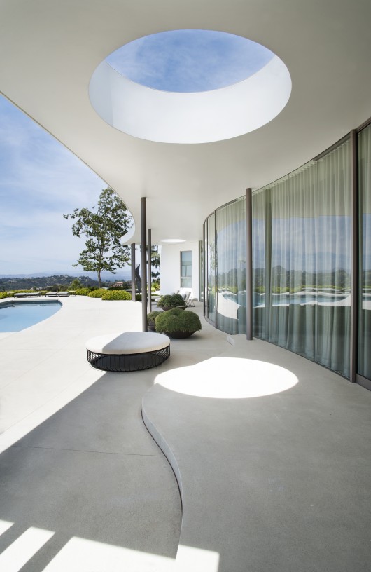 The residence, which started out fifty years ago as a relatively modest home is now enjoying another life; it is a contemporary LA house for very worldly clients. Other than the front courtyard, the majority of the exterior is a simple affair with sweeping white stucco curves and a long serpentine glass wall reflecting the generous scope of the views; the house is something of a gateway to the landscape.