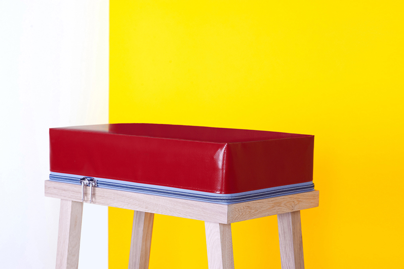 the innate animal-like features and quirky posture of a gymnastics vault guided the ‘truecolors’ collection which includes a bench, stool, barstool, bar bench, cabinet, and credenza.
