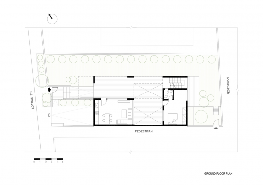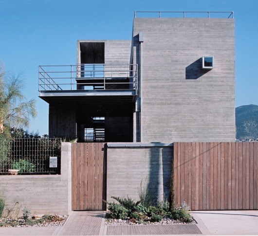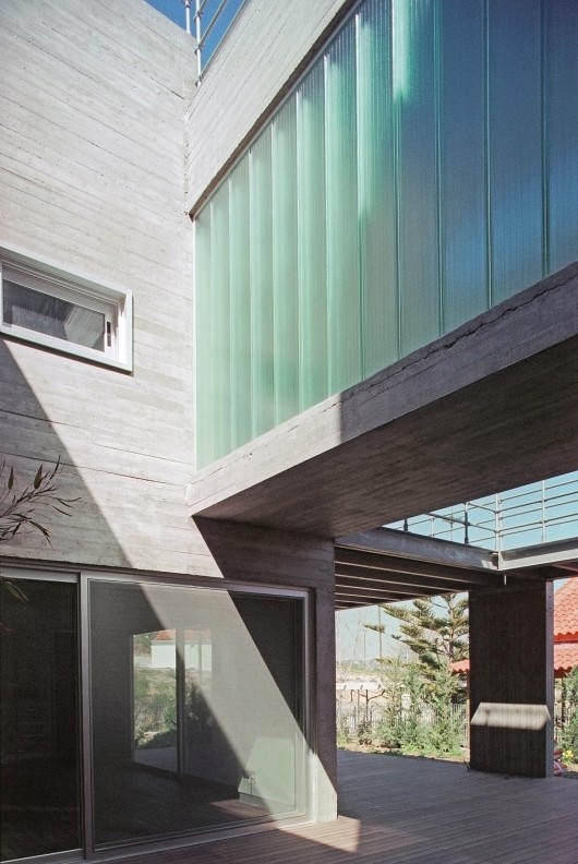 From the architect. In an elongated plot of 382,17m2 and of a width of 12m, in Porto Rafti (Attica, Greece), the brief called for a vacation house of approximately 280m2, including two potentially independent residences, common-use outdoor spaces and a garage. The duplex is arranged over two floors and an underground garage, with a northeast orientation, in order to be protected from the sun andon the first floor to take full advantage of the sea view to the north. The south side is nearly compact.