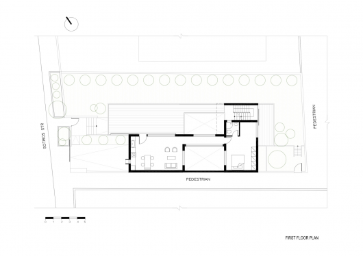 Two volumes form the duplex, one comprising the kitchens-living rooms, and the other comprising the bedrooms and staircase. They are connected via an enclosed corridor on the first floor, while on the ground floor the two volumes do not have an indoor connection. The ‘atriums’ formed between building masses form a network with the other outdoor spaces and the garden.