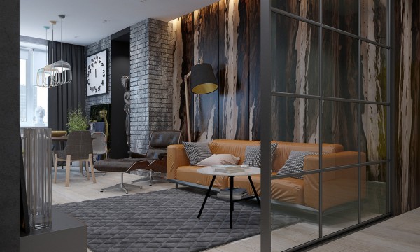 The first apartment is is a visualization for a creative family, with an artist and sculptor intending to take up residence. The open floorplan is broken up by interior glass walls, which allow for both like and privacy when necessary. The dark, rich hues are reminiscent of a dreary autumn day, which is surely why the style of this home has been described as “soft brutalism.” An accent wall in the main living area looks like the bark peeling off a dying tree while a burnt orange sofa represents those last falling leaves.