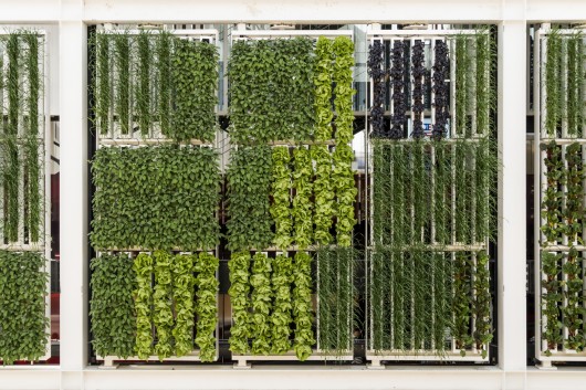 The pavilion participates in the conversation by acting as a scaffolding for ideas, and by embracing and displaying some very American hybridizations: analog and digital, natural and technological, innovative and recycled. On the extremely long and narrow site, defined by the unusually urbane masterplan, the pavilion is bounded by an analog wall (containing elevators, escalators, stairs, mechanical shafts, etc.); a purely digital roof (glazed in SPD SmartGlass that instantly switches from clear to opaque to respond to environmental conditions); a green Vertical Farm (employing hydroponic towers in a motion driven array); and a promenade rising through the pavilion made from salvaged Coney Island boardwalk.