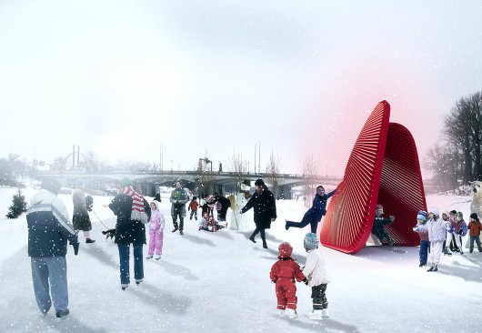 Capturing the spirit of the annual Warming Huts design competition, Paris and Barcelona-based architecture firm Kilometrezero, or KM(0), has developed this conceptual project for a warming hut in Winnipeg. Fondly referred to as the “Valentine’s Day concept” and aptly named KM(3) – Warming Heart, the project is intended as an inviting space for visitors to escape the winter chill between sports activities, and a symbolic structure that visually evokes the idea of warmth.