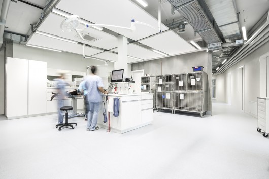 Since clinics require many and different kinds of diagnostic equipment it was decided to reveal the machinery’s ceiling installation over the corridors and maintain the technical character of the institution. The examination, surgery and recreation room ceilings are covered with glass fiber suspended ceiling panels, in order to be soundproof.