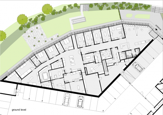The building is partly underground and the planted green roof serves as a garden and playground for the housing complex built on the same plot. The rooms requiring natural light are placed on the perimeter of the floorplan while spaces like storages, laboratories and surgery rooms than need artificial light are moved to the core.