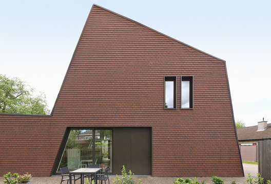 From the architect. The building plot is situated in a typical Flemish residential development with detached single-family houses that almost monotonously follow the building regulations of rectangular building volumes in reddish brick and gabled roofs of ceramic roof tiles.