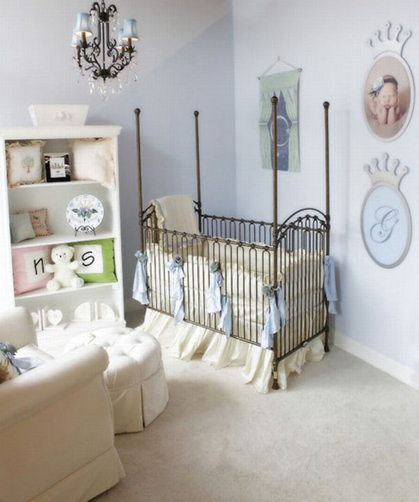 If you’re simply inspired by some vintage accents but you don’t want to put your entire room into the style, just have a soft and subtle adornment. Beautiful lines, princess accessories and a Victorian-esque crib filled with old-age spirits and feminine quality. And notice the chandelier hanging in the center of the room acting as a beautiful centerpiece.