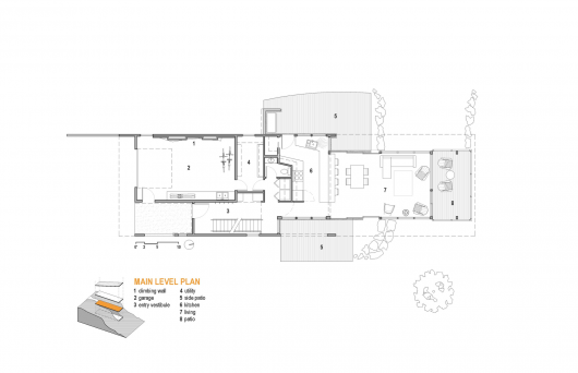 The owners were interested in a building that captured the sound of a creek located downhill from the house, which ultimately led to the design of a roof form that reflects the ambient creek-sound to the main living space. The house also makes the most of the stunning views of the Methow valley and its backdrop of mountain peaks, visible from both living and sleeping quarters. In the spirit of merging the internal space with its surrounding environment, the bedroom is designed to evoke the feeling of a treehouse.