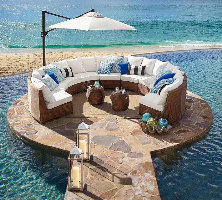 Pottery Barn honey wicker sectional on rounded platform next to ocean