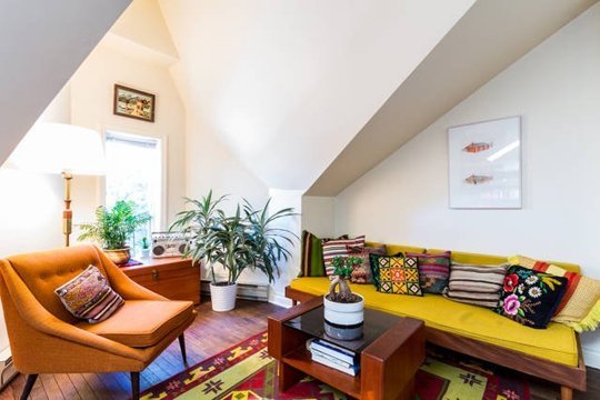 My apartment is a 590 square foot attic suite in a Victorian Townhome. After living abroad I returned to Toronto for graduate studies, bringing with me a collection of textiles from my travels. Most of the textiles pictured are from Turkey and Estonia, my living room carpet is a 1930 Baltic design handwoven by a relative of mine.