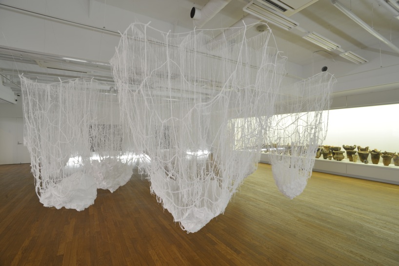 placed alongside japanese pots from the jomon period, the piece(s) is composed of thousands of filament thin ropes hung from the ceiling that are tied together to create semi-abstract shapes vaguely resembling the earthenwares.